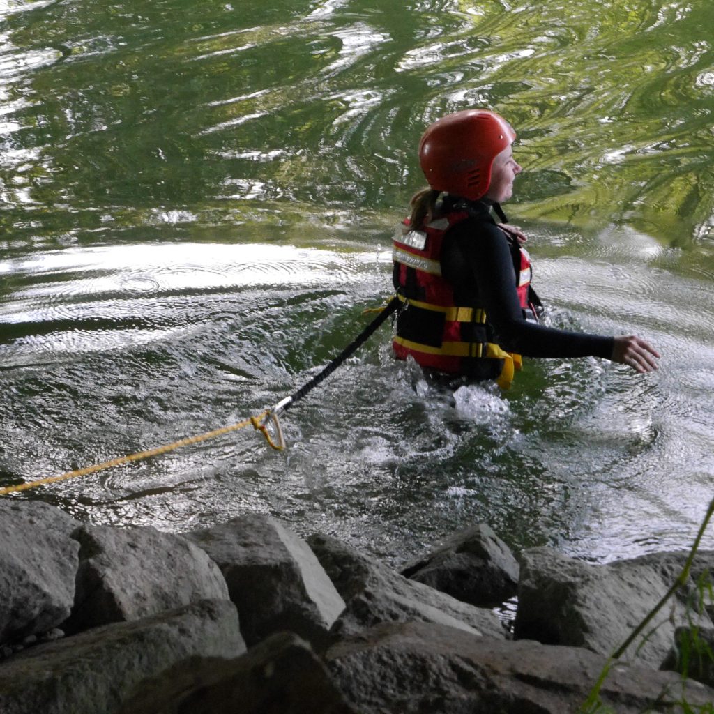 Die 16 Teilnehmer machten sich zuerst, im Zuge der Gefährdungsbeurteilung Fließgewässer, mit allen Gefahren und Risikofaktoren rund um die beschriebene Übungsstelle vertraut. Anschließend standen das Schwimmen in der Strömung mit eintreten ins Kehrwasser, der Bau einer Seilbrücke und eine „spontane“ Rettung zweier treibender Personen auf dem Übungsplan.